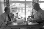 "Leif och Inger Klarenius från Humlekärret, Billdal, äter en mycket varierad och riklig frukost. De har också en mycket noggrant planerad och innehållsrik bestickväska, typ campingbag designad "Bernadotte [troligen Taffel]".
