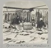 "Spilorna borttagas, Mollösund". Två kvinnor och en pojke tar ner fisk som hängt på tork.