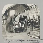 Två kvinnor sköljer långor i träkar. Bohuslän, Mollösunds fiskeläge, Orust, Morlanda socken, Mollösunds kapellförsamling.