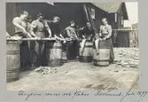 "Långorna rensas och fläkas. Mollösund. Juli 1899". En grupp kvinnor står och rensar fisk med tunnor som bord.