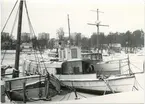 Öland, Borgholm. Parti av hamnen med spannmålssilo och motorseglare.