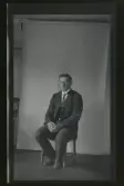 "Axel Fredriksson." Porträtt av skogsarbetaren och amatörfotografen Axel Fredriksson, sittandes på en stol framför en pappersfond.