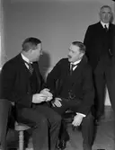 Mönstringspremiär på Slottskällan - inskrivningsförrättarna E Nordström och Gahnfors i arbete, Uppsala februari 1942