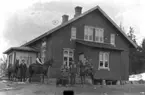 Torkels August med sin familj i Råryd, Sällstorp. August, makan och deras sju barn samlade för fotografering utomhus framför en häck.
