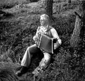 TVÅ KVINNOR SITTER I GRÄSET OCH BRODERAR OCH EN SPELAR FIOL. Foto: juli 1910.