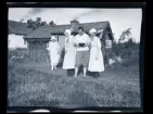 Två unga kvinnor står på ett fält med buskage i bakgrunden i Krogsered. Flickan till höger heter Agnes Johansson och är kusin till fotografen, men kamraten är okänd. Johns faster Augusta och farbror August bodde båda i Krogsered.