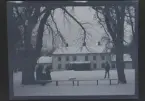 Elever från Årstads skola roar sig i snön på rasten, med Årstads kyrka i bakgrunden.