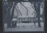 Man i vardagskläder står framför trädgårdsstaketet till ett bostadshus vid korsningen Storgatan/Hallanäsgatan. I bakgrunden syns tornet på S:t Laurentii kyrkan.