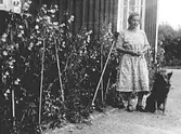 En kvinna som sitter på en klippa med en hund i knät, någonstans i Öregrund. Text i album: "Öregrund 1927".