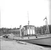 Vykort över norra hamnen i Sundsvall med båten Laxen i förgrunden.