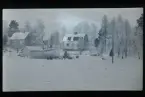 Vy över en trädgård. Mellan träd och buskar skymtar två hus. I förgrunden står lantbruksredskap.