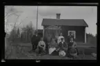"Karl Pettersson, Gustav Larsson med anhang" Ett sällskap sitter ute på en gärdsgård och en vedstapel.