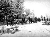 TRANSPORT AV TIMMER MED TVÅ HÄSTANSPÄNDA ARBETSVAGNAR.