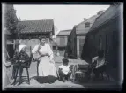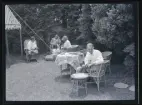 Arkitekt Thoresens utställning 1937, för varuhuset Nordiska Kompaniet i Stockholm. Interiör med möbler; två fåtöljer står på var sida om ett runt pelarbord. På bordet en lampa, en skål samt en vas med blommor. I bakgrunden ett draperi. På var sida om möbelgruppen en piedestal med bordslampa i form av en urna.