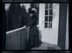 Elin Morthensen (född Anrep) står på den lövade farstukvisten till familjen Morthensens villa Solveden, Djursholm.