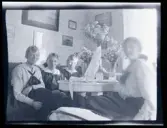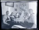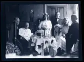 Handlaren Olof Larsson i Tvååker med familj. Olof bedrev till 1909 i byggnaden som kallades "Hotellet" dels gästgiveri som arrendator, dels en lanthandel i byggnadens södra del. Efter en schism mellan Larsson och hotellägaren Johan Elis Johansson flyttade Larsson år 1909 över affären till sitt eget nybyggda hus på fastigheten som låg rakt över vägen. Samma år som detta foto togs, alltså 1912, tog Konsum Framåt över butikslokalen för sin rörelse. Familjen flyttade till Varberg hösten 1915.