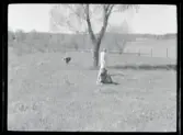 Hemvärnet. 20/4, 1941. Några män i hemvärnsuniform skyndar iväg över en äng. I bakgrunden syns baksidan på dåv. arrendatorsbostaden på Teleborgs slott, även kallad Tuvan, Tufvan.