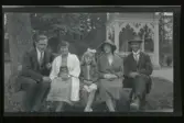Ett sällskap vid en paviljong i en trädgård. En kvinna som sitter på räcket, två män och en liten pojke. "Källan Bie badort, Floda. "