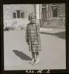 585/8 Facit Tokyo Daberg. Porträtt av ett barn i kimono som står i en trädgård.