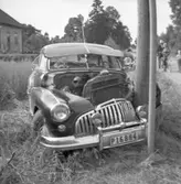 Krock 26 juni 1967 En vit buss ligger på sidan på gatan nära en refug i bakgrunden. I förgrunden syns en svart bil med intryckt sidodörr och saknad framruta. Båda fordonen har varit med om en krock. I bakgrunden till höger syns vuxna med två cyklar samt barn som betraktar olycksplatsen.