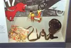 Dokumentation av den lilla utställningen av "Kulor, Krus och Kaviar". Sätts upp på Västerås stadsbibliotek. Vandringsutställning. Samarbete mellan Tekniska museet och Riksutställningar. Karlssons klister-monter.