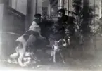 En stuga, man och kvinna i Kalmar södra koloniområde, fotograferat omkring 1930. Kalmar södra koloniförening grundades 1917 och har idag 105 kolonilotter. Området ligger strax söder om länssjukhuset i Kalmar med huvudingång från Stensbergsvägen.
