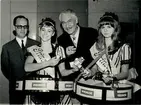 "Dallasprinsessor" håller upp Prince-cigaretter vid Malmös stadsteater 1961. Två män i kostym står i bakgrunden.