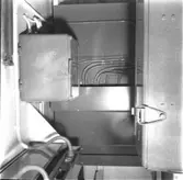 Gårdssidan vid Styrmansgatan 14. Elkablar fästa i väggen hänger över gården. I trappan står en krukväxt.