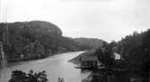 Vägstation AC 16, Åsele, färjvaktarbostad Gavsele. Bostadshus för färjvaktaren. I förgrunden mindre byggnad, eventuellt väntkur för resenärer. Mansperson till höger, troligen färjvaktaren. I bakgrunden färjleden.
