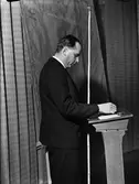 Intendent Nils Ålenius vid Upplandsmuseet föreläser, Uppsala 1946