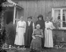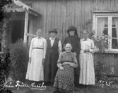 Okänt bröllopssällskap med äldre brudpar framför en farstukvist.