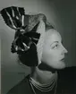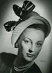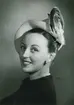 Nordiska Kompaniet, NK. Porträtt av modell, möjligen Hjördis Grundel-Starenius, med hatt i svart filt och mönstrat hattband i turkos. Uppvisning mars 1947. Hattar använda vid franska avdelningen.