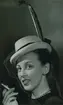 Porträtt av kvinna i hatt. Beige och brun filt med fasanpennor och flor. Hatt använd vid franska avdelningens uppvisning september 1947.