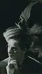 "Hatt använd vid Franska avd. uppvisning mars 1947". Modell i hatt med liten kulle och smalt, uppvikt brätte. Flor och fjäderdekoration. Modellen håller en cigarett i handen.