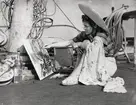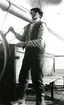 [från fotobeskrivningen:] [---] "Konstnärinnan Hilde Lütkens-Bengtsson [sic] vid sitt staffli ombord på barken Passat år 1947 på resa Finland-Kapstaden" [---]