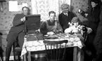 FAMILJ SAMLAD RUNT KAFFEBORDET. EN TRATTGRAMMOFON STÅR I BAKGRUNDEN.