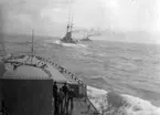 Från kung Gustaf V:s statsbesök i Estland 27 juni 1929, monarken hälsar på estniska representanter ombord på pansarskeppet SVERIGE i Tallinns hamn.