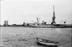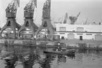 H län, Hamnförrådet i Kalmar. Avvecklades 1946. Översikt med diverse förrådsbyggnader, järnvägsvagnar, hamnkranar, upplag av diverse material, "skrot".