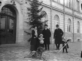 "Stora huset", huvudkontor för Johan Thermaenius & Son, samtidigt bostad för Alfred och Gottfrid Thermaenius med familjer (numera kommunalhus). Tre vuxna, två barn och en hund framför huset. Gerda Thermaenius med sina bröder och barnen Maj och Carl-Edvard.