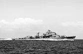 Fartyg, jagare "Klas Uggla", i rörelse. Vågor syns på havet.