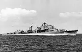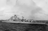 Fartyg, jagare "Klas Uggla", i rörelse. Vågor syns på havet.