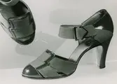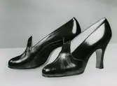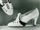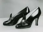 "Lädermarknad 1949" Påskrift. Ett par svarta damskor med klack och snörning. Skinnväska.