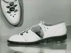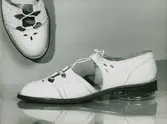 "Sommarskor. Sommarsportskor av vitt flätat skinn. Brun garnering. Låg klack". Snörning.