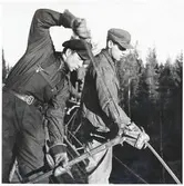 "Barsebäckarn" och Holm arbetar med den nya ovana aluminiumlinan för återledning på montagetåg nr 8. Bara nya specialhandskar användes. Nånstans på sträckan Östersund-Storlien.