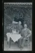 "Far och Mor." Porträtt av Fredrik Vilhelm Eriksson (f.1854) och Anna Maria Larsdotter (f.1856) som sitter vid ett bord fullt av gratulations-blommor.