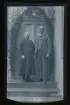 "Axels far och mor." Porträtt av fotografens föräldrar, Fredrik Vilhelm Eriksson (f.1854) och Anna Maria Larsdotter (f.1856) ståendes framför en lövad dörr. Någon fyller 85 år.