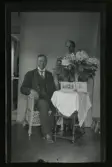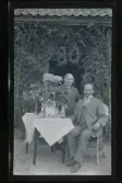 "Mor och far guldbröllop. 1879 - 1929" Fotografens föräldrar Anna Maria och Fredrik Vilhelm Eriksson sitter vid ett bord med gratulations-blommor.
