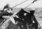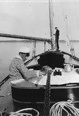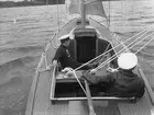 Från prisutdelningen efter seglingarna om Skärgårdskryssarepokalen i juli 1944, rorsman G. Ingelsson från Bällstavikens SS, som segrade med 22-S70 INGEL, tillsammans med oidentifierad besättningsman.