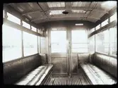 Stockholms Läns Omnibuss, SLO Enebyberg Buss 114. Bilden visar förarplatsen, omedelbart under ratten ser man växelväljaren, ovanför fönstret ser man förstärkaren för högtalaren. På sidan om förarplatsen ser man bordet för enmansbetjäning