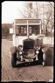 Erik Carlsson sitter vid ratten i Kållereds första omnibuss från Kållered bussbolag (Kålleredbussarna), Bastionsplatsen i Göteborg cirka 1923 - 24. Det var Erik som startade företaget som körde linjen Göteborg-Anderstorp-Hällingsjö.